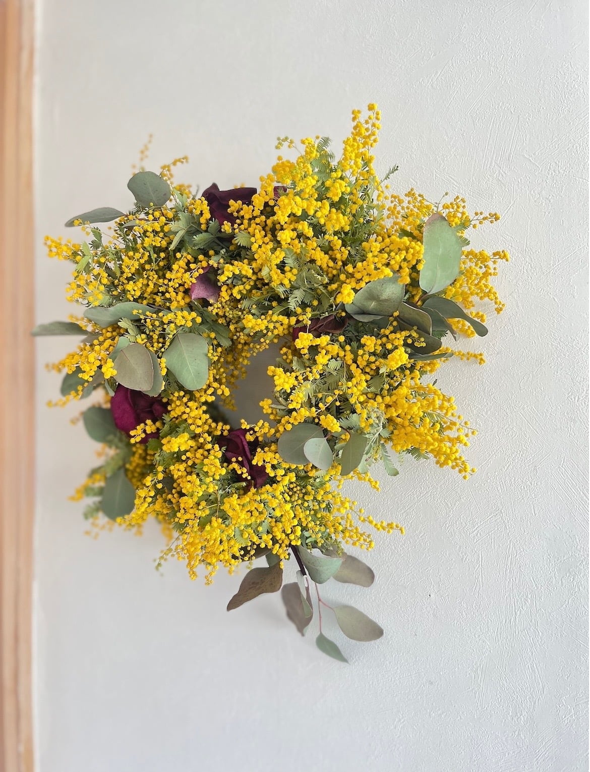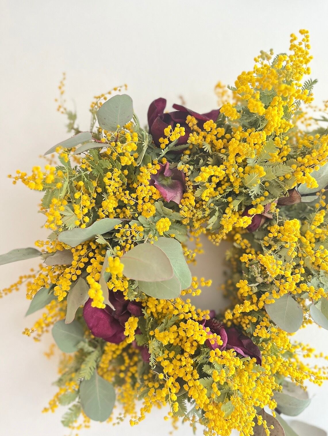 ミモザの黄色に木蓮とクリスマスローズのワインレッドが品のある優雅なリースです