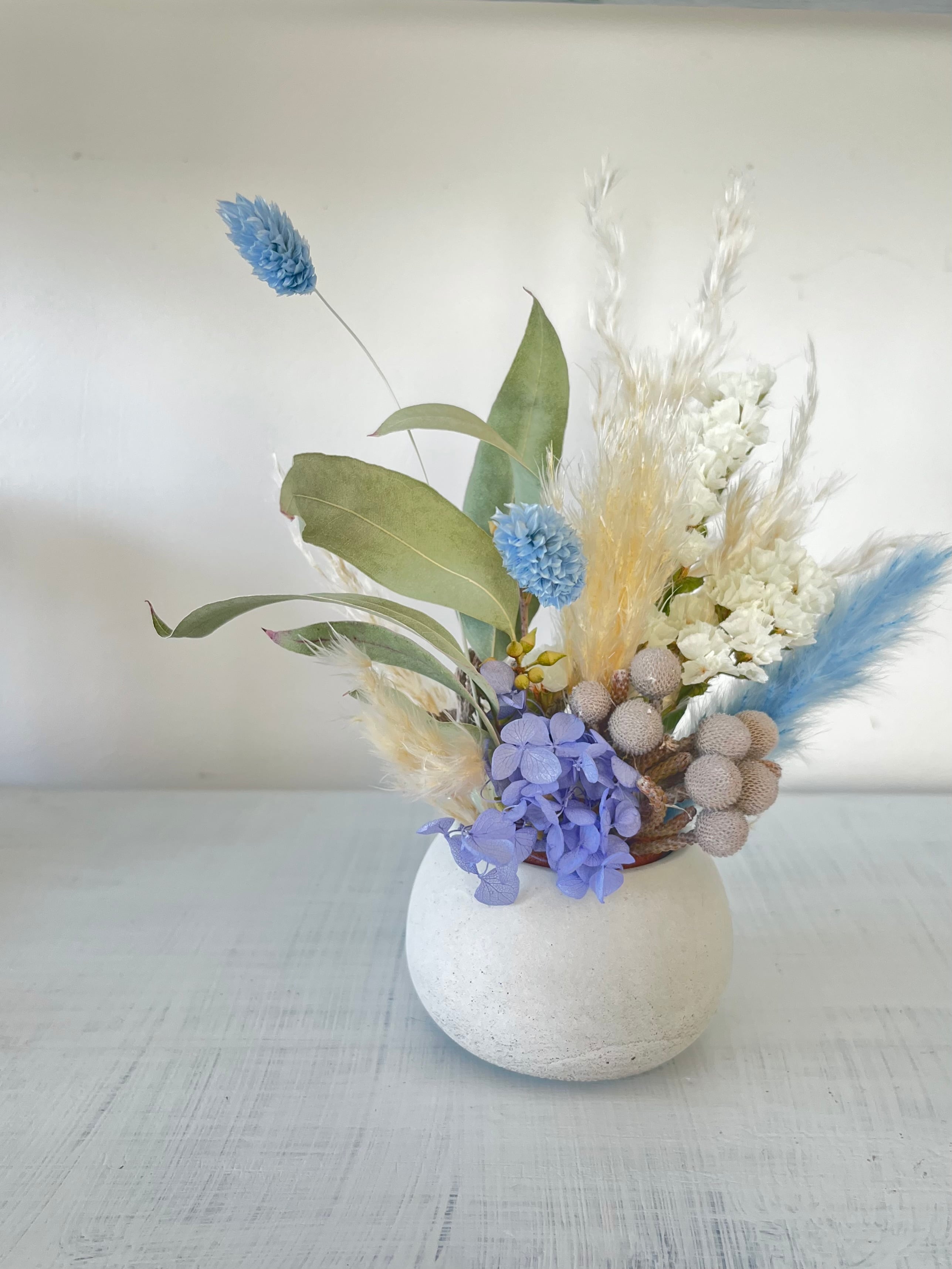 ひとつひとつ手づくりしたオリジナルのフラワーベースにドライフラワーをアレンジした